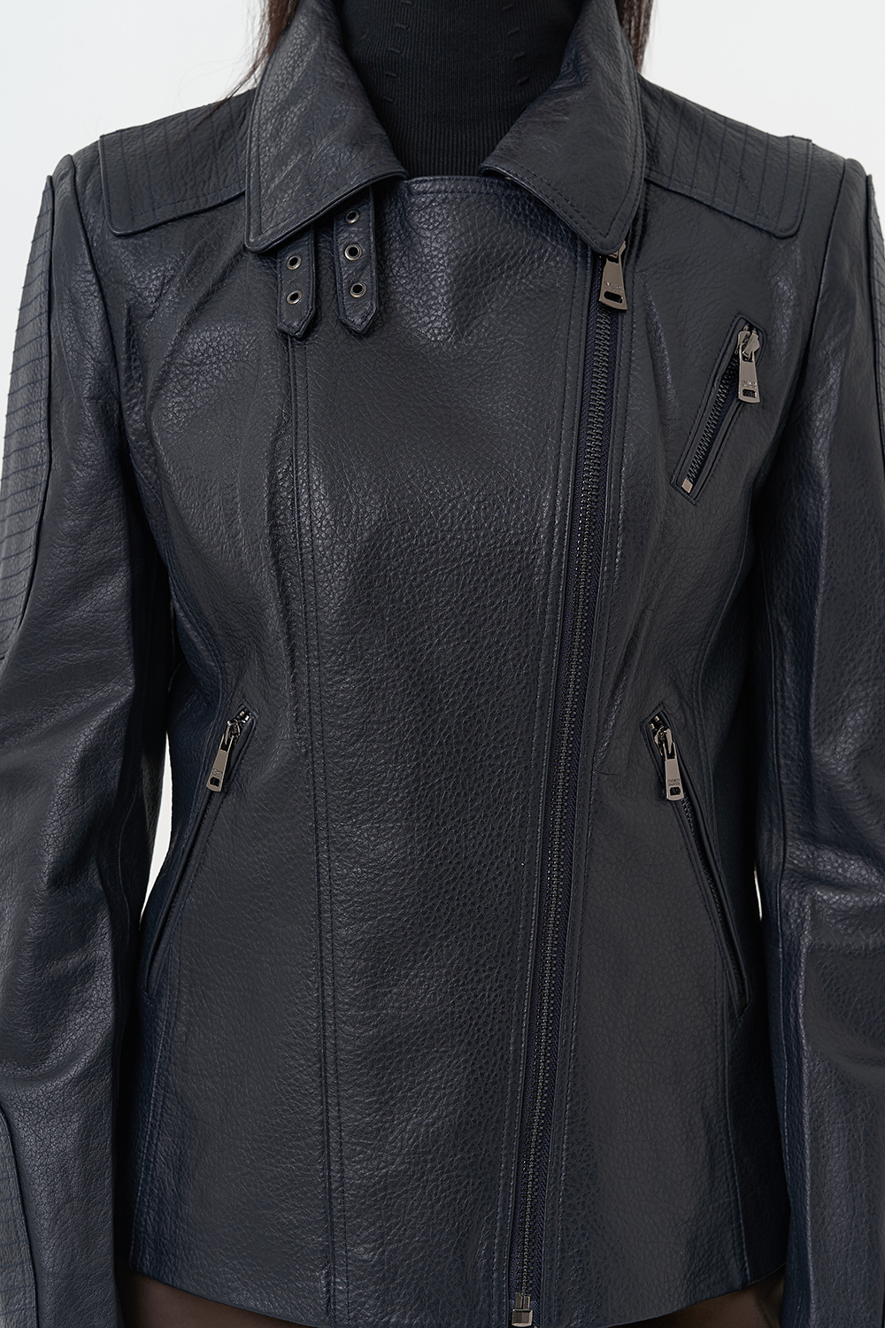 Длина изделия - 60 см;Длина рукава - полный;Цвет -синий;Материал - натуральная кожа;Фасон - приталенный;Вид застежки - молния;Вид ворота - стойка