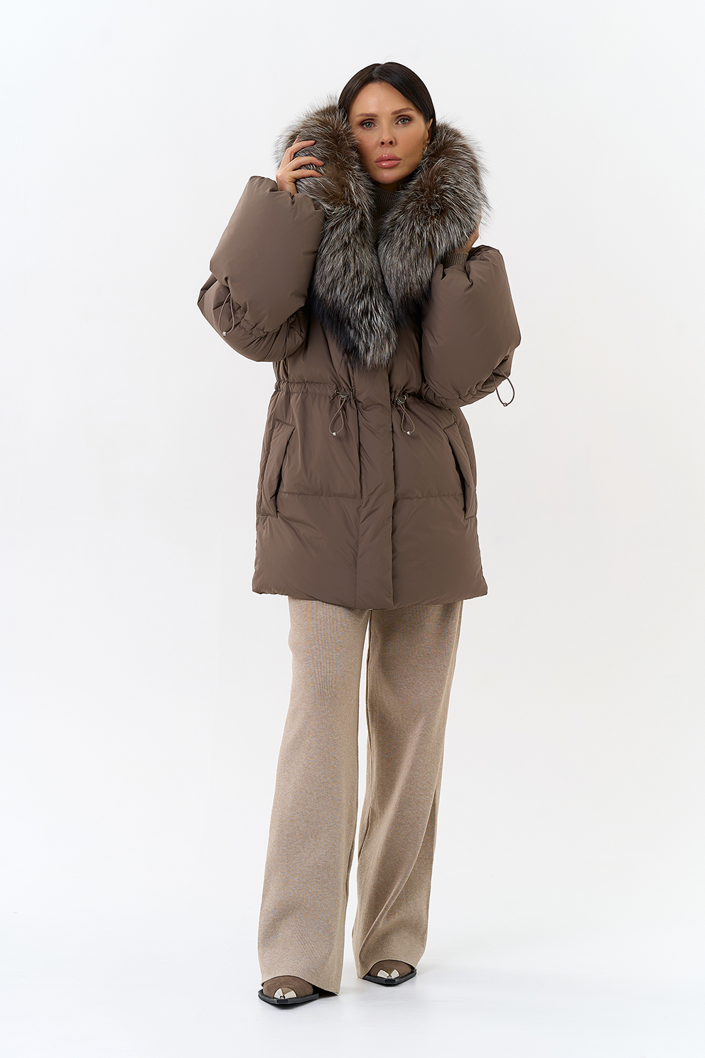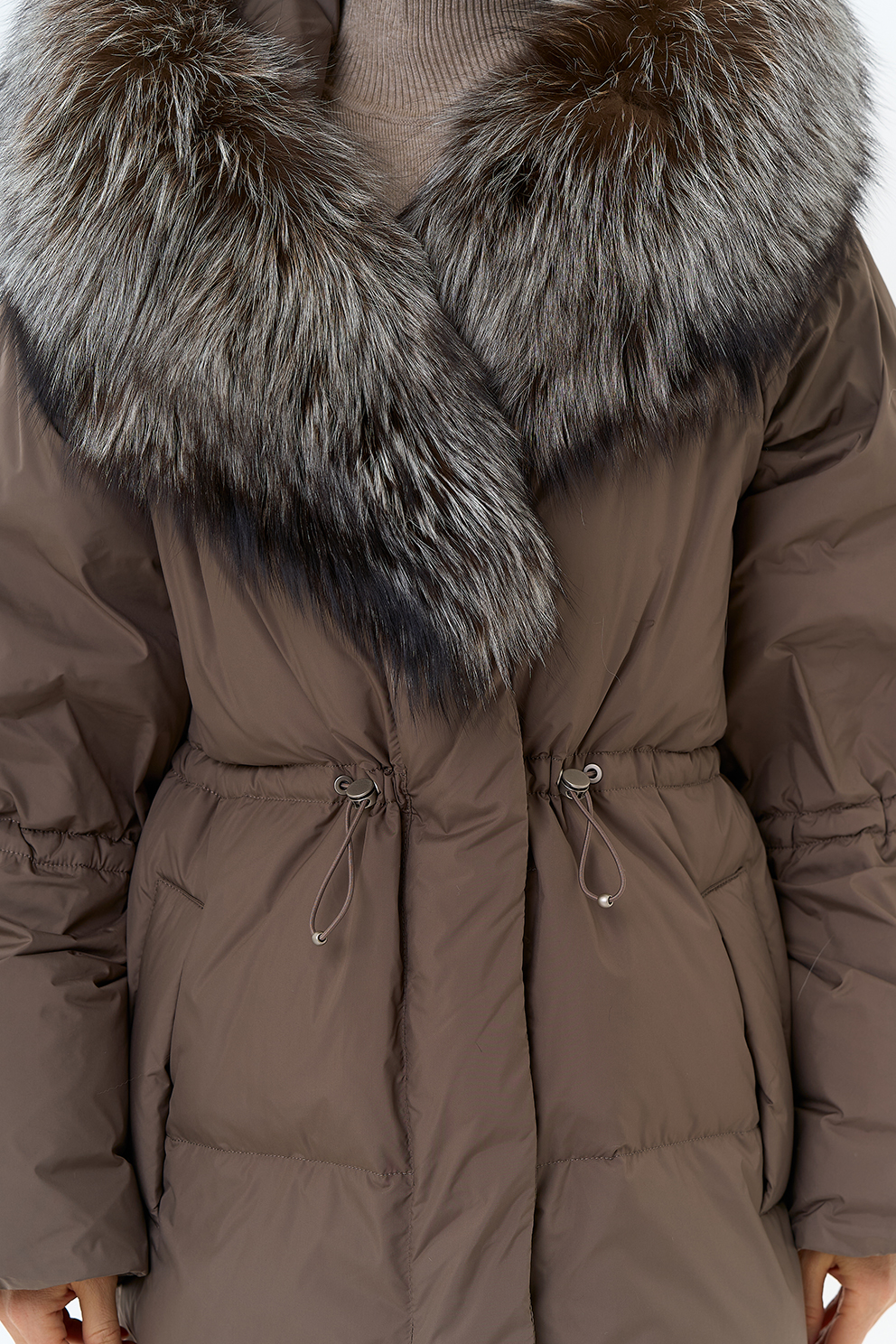 Крой воротника - капюшон, отделка чернобурка